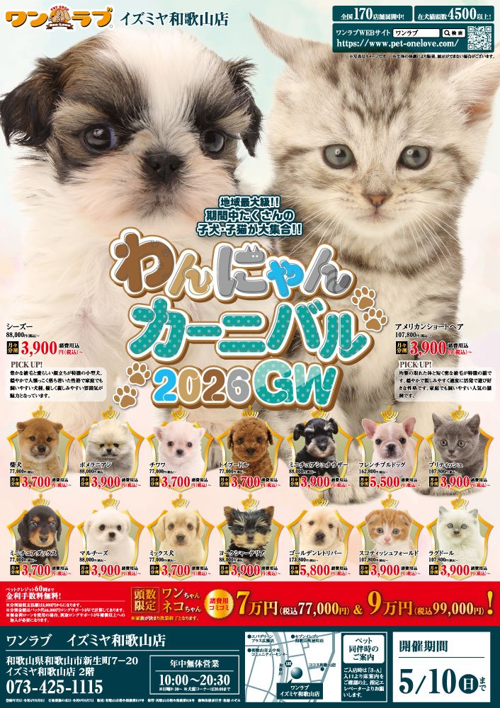 和歌山の皆さま お世話になっております!!4月25日(土)より、ペットショップワンラブ イズミヤ和歌山店にて わんにゃんカーニバルGWを開催させて頂きます!!4/25~5/10までのイベント期間中(^^)/厳選されたかわいい子犬子猫が大集合!!愛らしい子犬子猫が元気に遊びまわっておりますよ~ 気になった子はぜひ抱っこしてあげてくださいね(^_-)-☆さらに、小動物コーナーでもお迎え頂きやすいイベントが開催中です!!各種ペット用品も特価でご用意致しておりますのでこちらも要チェックです♪ペットの事ならぜひご相談ください!ワンラブが全力でサポートさせていただきます(^^)/改めまして、地域の皆様に愛されるペットショップとしてスタッフ一同頑張ってまいりますm(__)m 絶対に損はしないイベント期間となっておりますので、この機会にぜひ遊びに来てください(^^)/ ■イズミヤ和歌山店 在籍中の子はこちらhttps://www.pet-onelove.com/puppy/?shop=268■イベントチラシはこちらからhttps://www.pet-onelove.com/column/post-8689