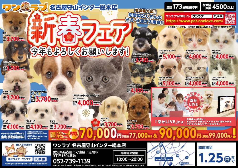 1月10日(土)より、ペットショップ ワンラブ 名古屋守山インター総本店にて、新春フェアを開催させていただきます!!