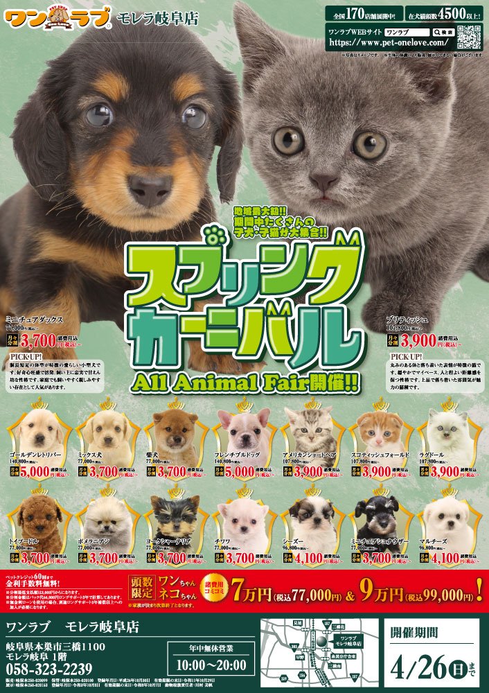 4月11日(土)より、ペットショップワンラブ モレラ岐阜店にてスプリングカーニバルを開催させて頂きます!!