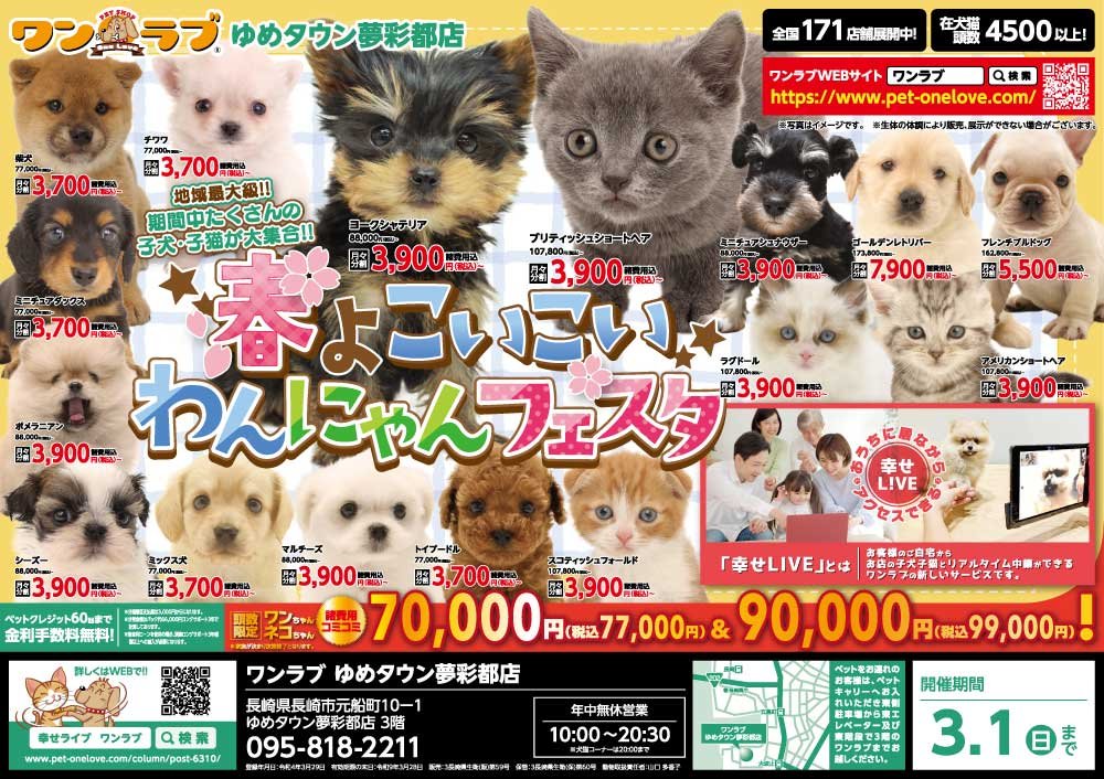【春よこいこい☆わんにゃんフェスタ 開催!!】長崎県 ワンラブ ゆめタウン夢彩都店 フェア開催!! 2/14~3/1まで
