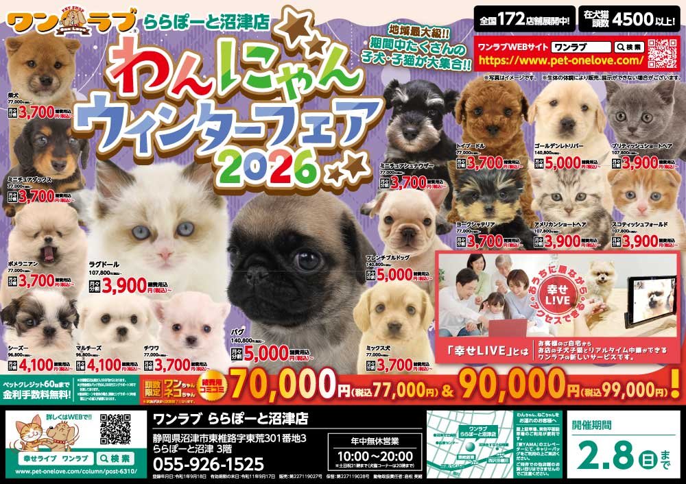 【わんにゃんウィンターフェア2026 開催!!】静岡県 ワンラブ ららぽーと沼津店 フェア開催!! 1/24~2/8まで